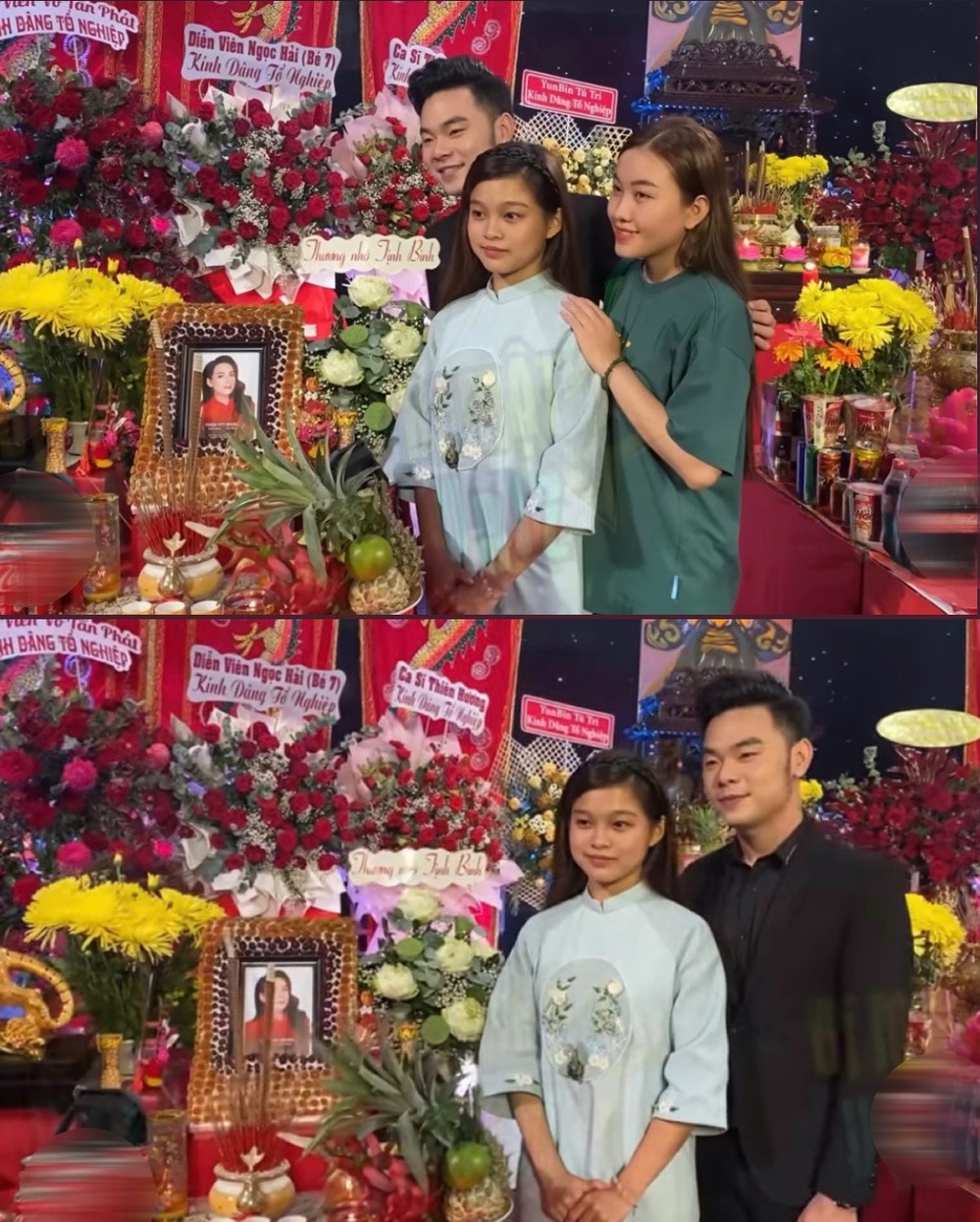 Tuyết Nhung và Thiêng Ngân cũng tới viếng mẹ nuôi. (Ảnh: Chụp màn hình Youtube Bí mật Vbiz)