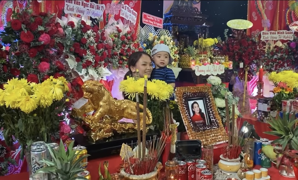 Con trai út hồn nhiên lưu kỷ niệm cùng di ảnh của mẹ nuôi. (Ảnh: Chụp màn hình Youtube Bí mật Vbiz)