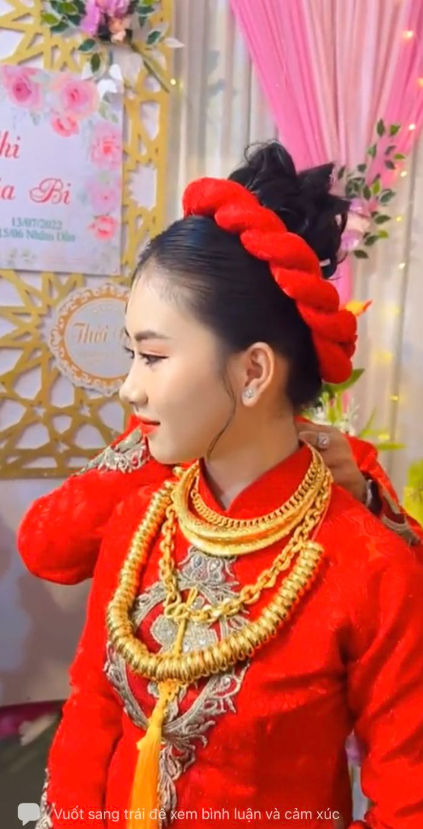 Chưa kịp xuýt xoa với số quà cưới của đôi vợ chồng, cọng dây chuyền sáng lấp lánh của bác gái cũng khiến netizen phải lóa mắt. Theo phân tích của các ”thám tử mạng”, có lẽ gia thế của gia đình của chú rể cũng phải thuộc hạng ”không phải dạng vừa”. Với số lượng vàng quá nhiều, đeo không xuể, chú rể phải luồn vài chục chiếc nhẫn vào sợi dây rồi đeo lên cổ cô dâu.