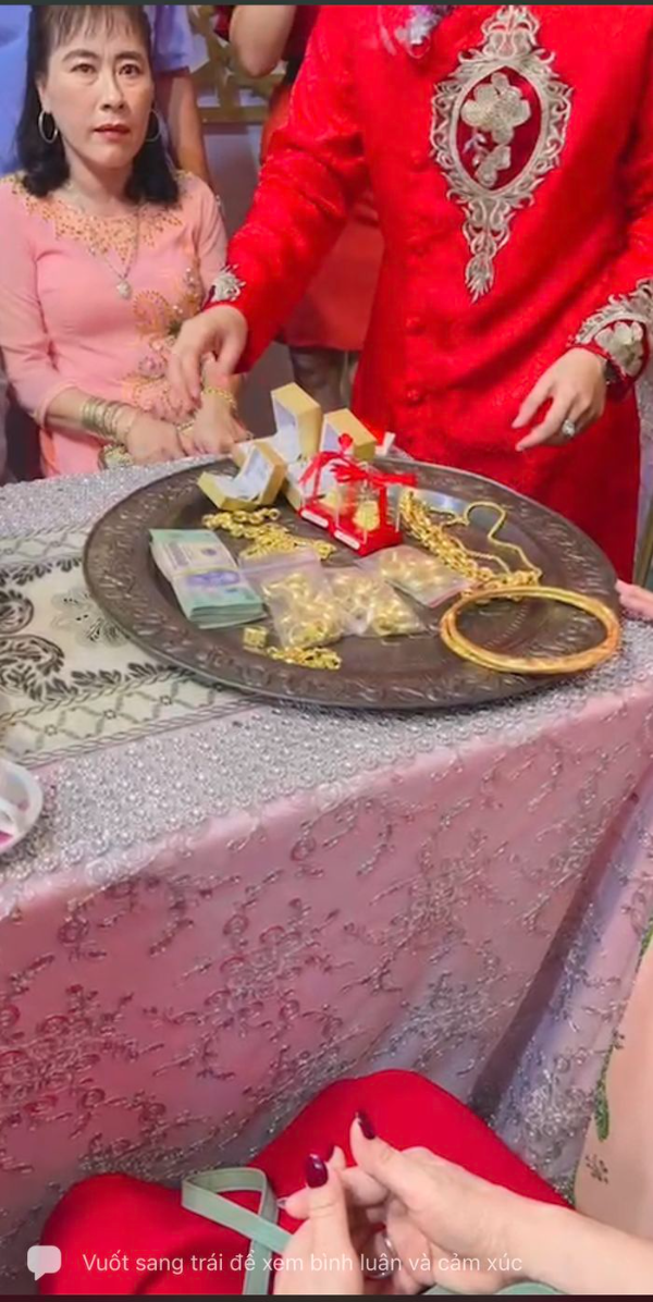 Thế nhưng, điều gây ấn tượng nhất chắc có lẽ là số của hồi môn mà đôi bạn trẻ nhận được trong ngày hạnh phúc. Theo như đoạn clip, cô dâu và chú rể nhận được sính lễ khủng gồm 52 cây vàng nặng 2kg, một bộ trang sức hột xoàn gồm đôi hoa tai, nhẫn cưới và nhẫn lẻ có giá trị lên đến vài tỷ đồng. Chưa dừng lại ở đó, mẹ chú rể còn dành riêng cho hai con 2 cuốn sổ tiết kiệm có giá trị 2 tỷ đồng.