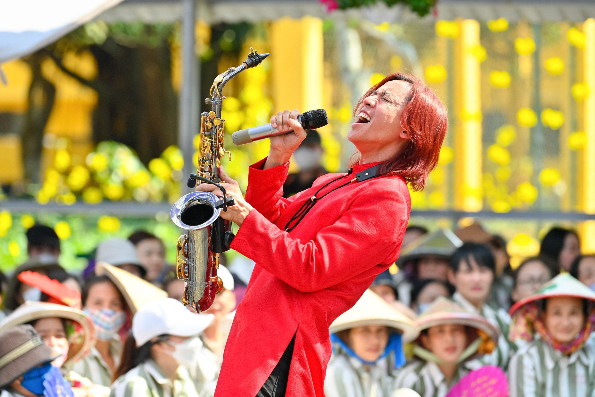 Nhạc sĩ Hoài Phương vừa hát vừa thổi kèn – Ảnh: THÀNH PHẠM