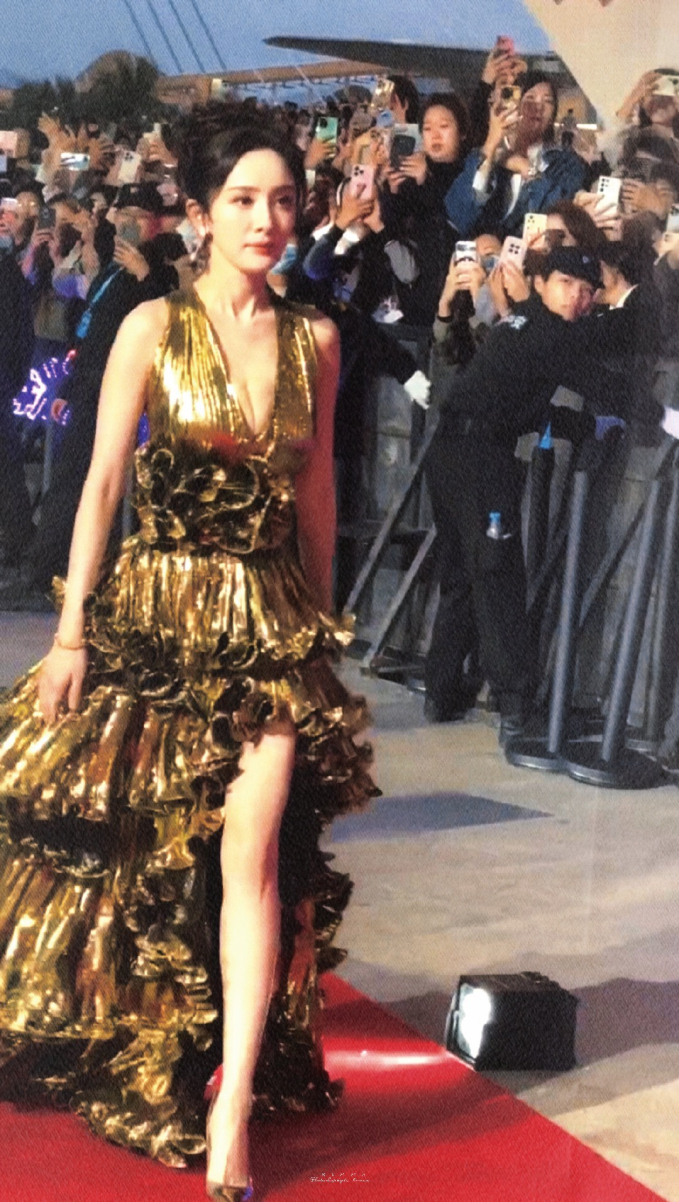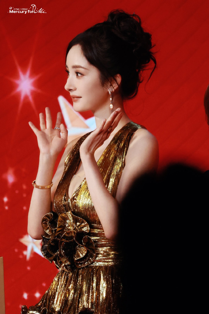 Dương Mịch hóa quý cô vừa gợi cảm, vừa trang nhã trong bộ váy có thiết kế cầu kỳ, được xẻ ngực và xẻ tà để giúp người mặc khoe sắc vóc. Minh tinh 37 tuổi lựa chọn kiểu tóc búi cùng tông trang điểm nhẹ nhàng để tôn lên đường nét khuôn mặt thanh tú, cuốn hút và làn da trắng