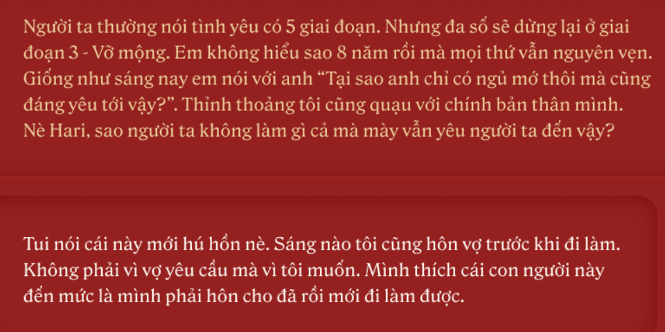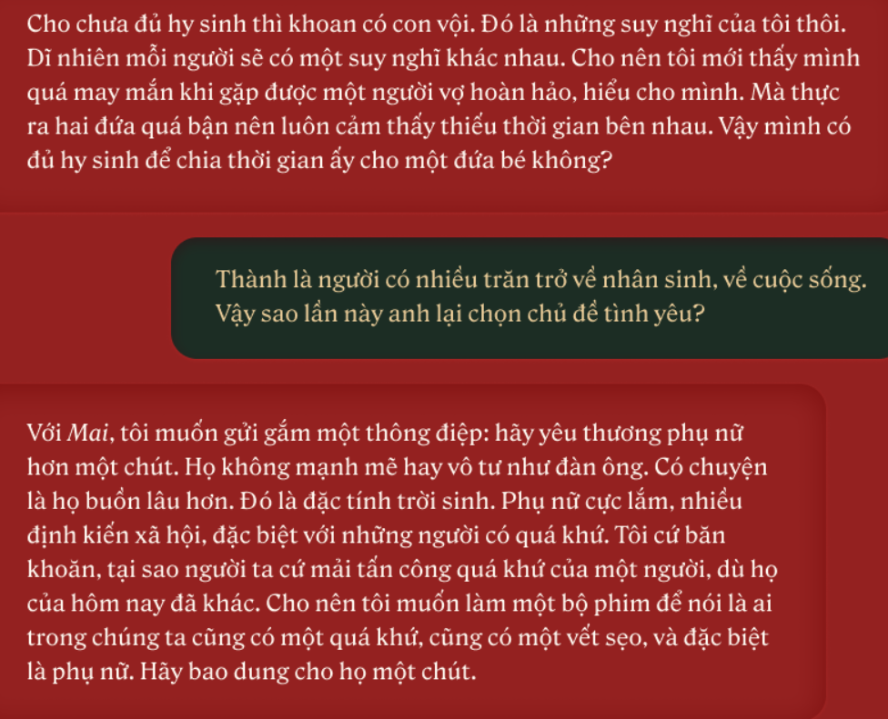Mới đây, Trấn Thành gây chú ý khi đăng tải loạt ảnh đen trắng kèm theo những câu nói anh từng gây sốt trong Người ấy là ai, điển hình là: “Tôi từng sợ hãi hôn nhân nhưng lại muốn lập gia đình với cô ấy” hay “Tôi với vợ tôi không phải gu của nhau nhưng chúng tôi yêu nhau vì chúng tôi cho nhau thứ cả hai cần”; “Đời tôi yêu nhiều, vấp ngã nhiều và đau khổ lại càng nhiều. Đôi lúc ngại yêu, sợ bắt đầu! Và cứ thế, tôi yêu thương vô định, hời hợt và tạm bợ… cho đến khi gặp em”…