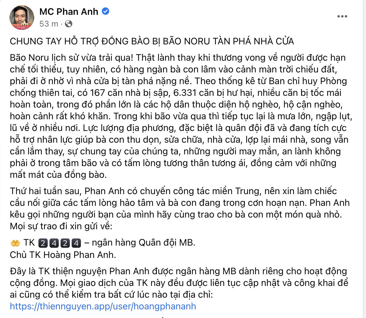 Trong chia sẻ trên trang cá nhân, Phan Anh kêu gọi những nhà hảo tâm quyên góp tiền để dựng lại nhà cho các hộ dân có nhà bị bão làm sập, đổ, tốc mái sau bão Noru. Theo anh, dự kiến sẽ có 300 hộ gia đình được hỗ trợ, thời gian trao quà ngay từ ngày 2/10/2022. Mọi chi tiết sẽ được cập nhật liên tục trên trang web.