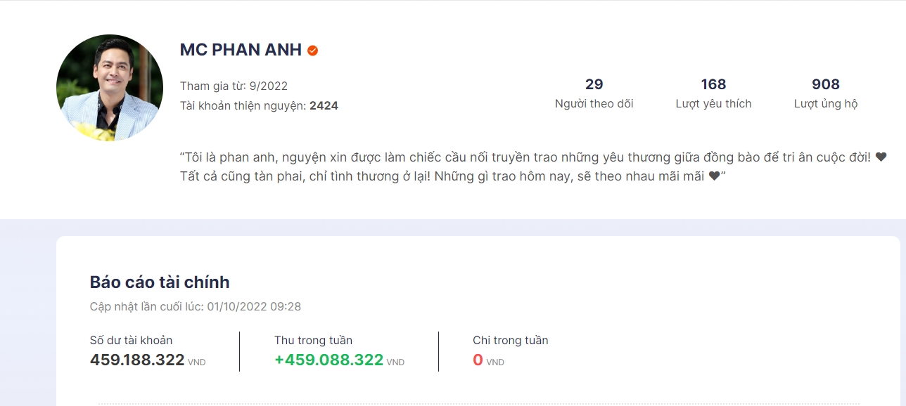 Mặc dù từng bị chỉ trích, song Phan Anh vẫn kêu gọi được số tiền khủng gần 500 triệu đồng chỉ sau 1 đêm. Anh cũng lập một trang web để mọi người có thể tiện theo dõi những khoản tiền ra vào vào.