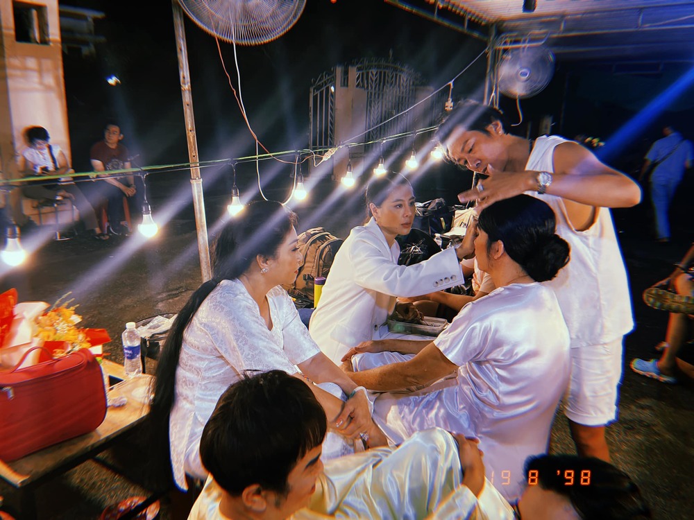 Cô chỉnh sửa, theo dõi phần trang điểm của đàn anh Hoài Linh. (Ảnh: FB Nam Thư)