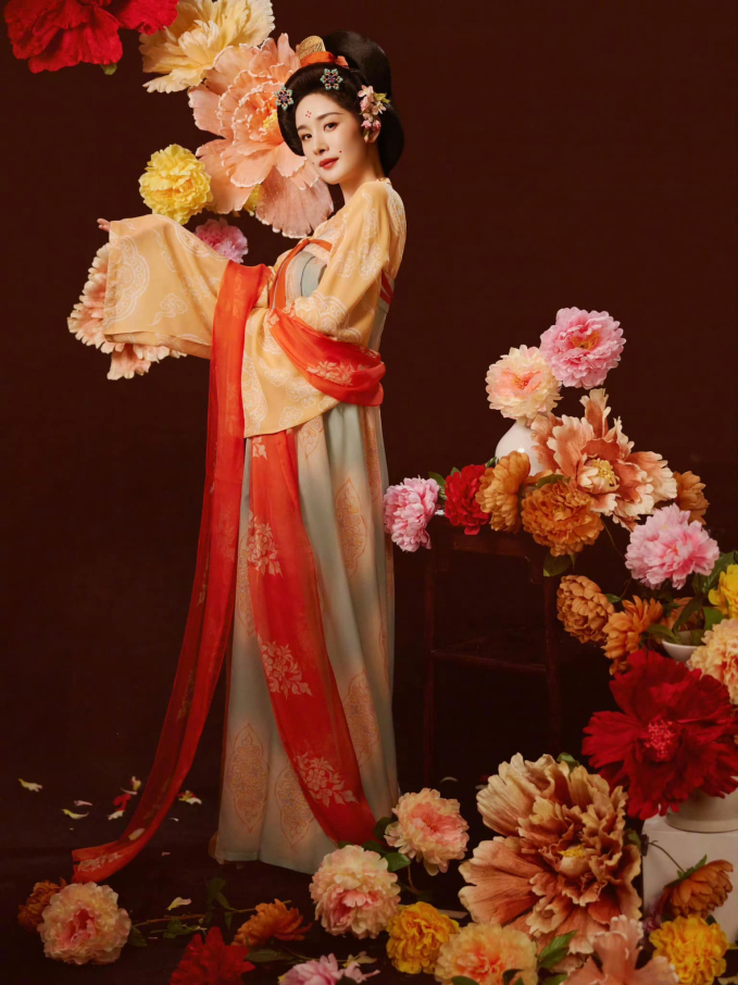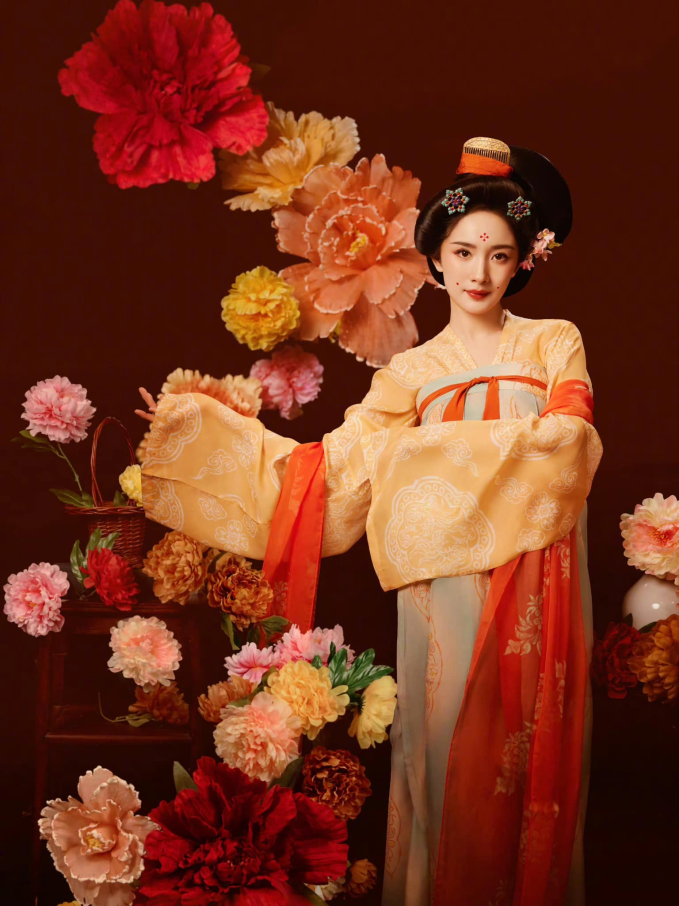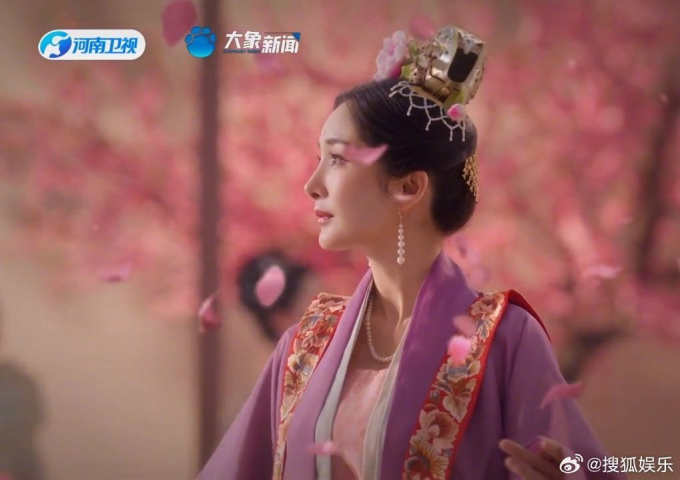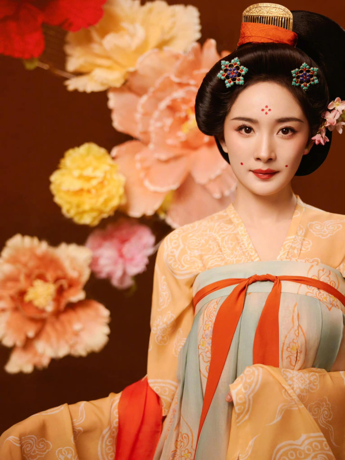 Tạo hình phụ nữ thời Đường nhiều màu sắc tươi sáng càng tôn lên nhan sắc rạng rỡ của nữ diễn viên. Dương Mịch được netizen khen ngợi là đẹp rực rỡ không kém cạnh các đóa hoa mẫu đơn xung quanh